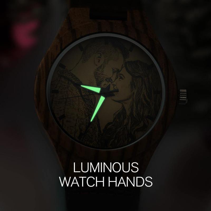 Men's Engraved Wooden Photo Watch Brown Leather Strap 45mm