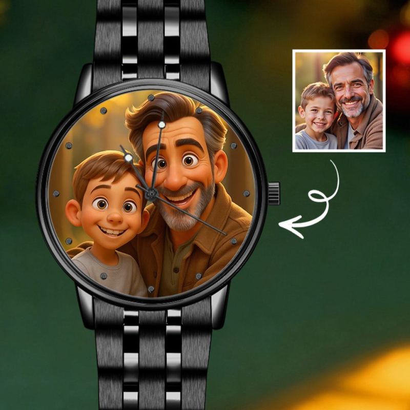 Custom Cartoon Photo Watch · Black Steel Edition | Timeless Love in Every Second | Best Christmas Gift for Family, Couple, Friend