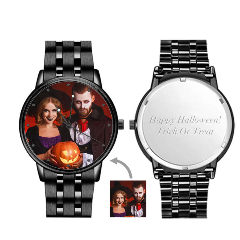 Men's Engraved Black Alloy Bracelet Photo Watch -Personalized Halloween Photo Watch Gift