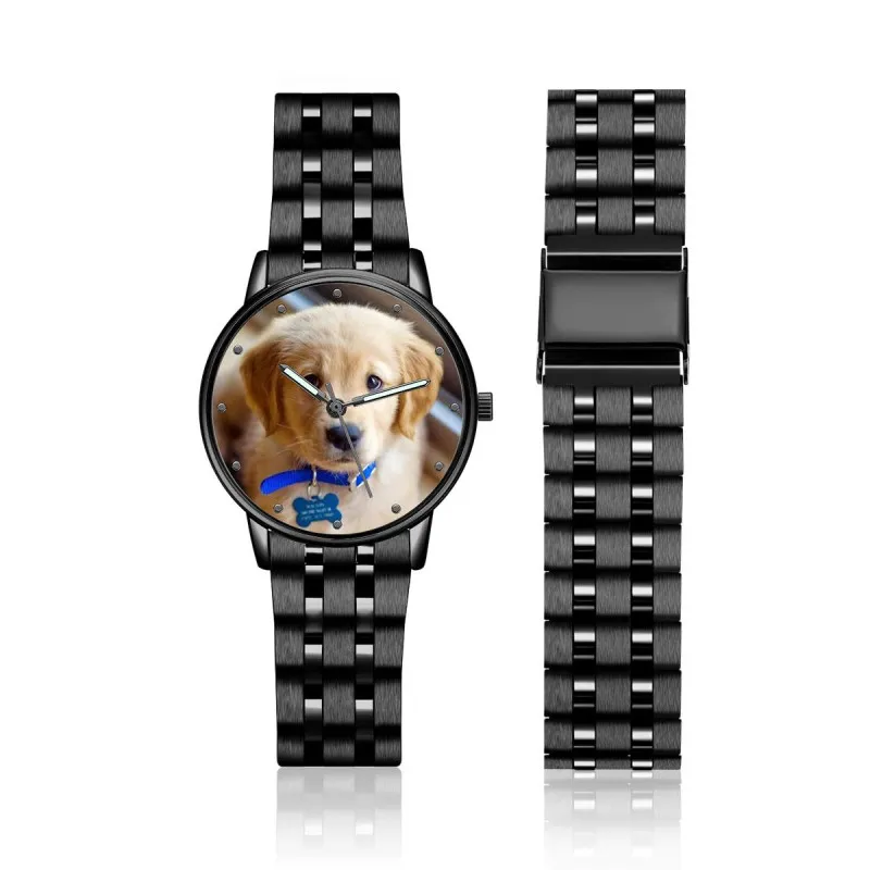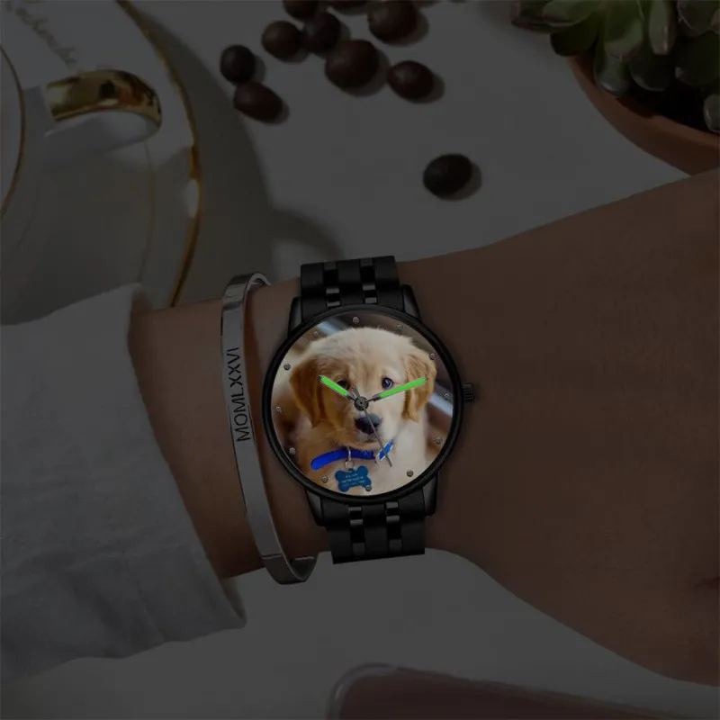 Men's Engraved Photo Watch With Luminous Pointer Black Alloy Bracelet 38mm