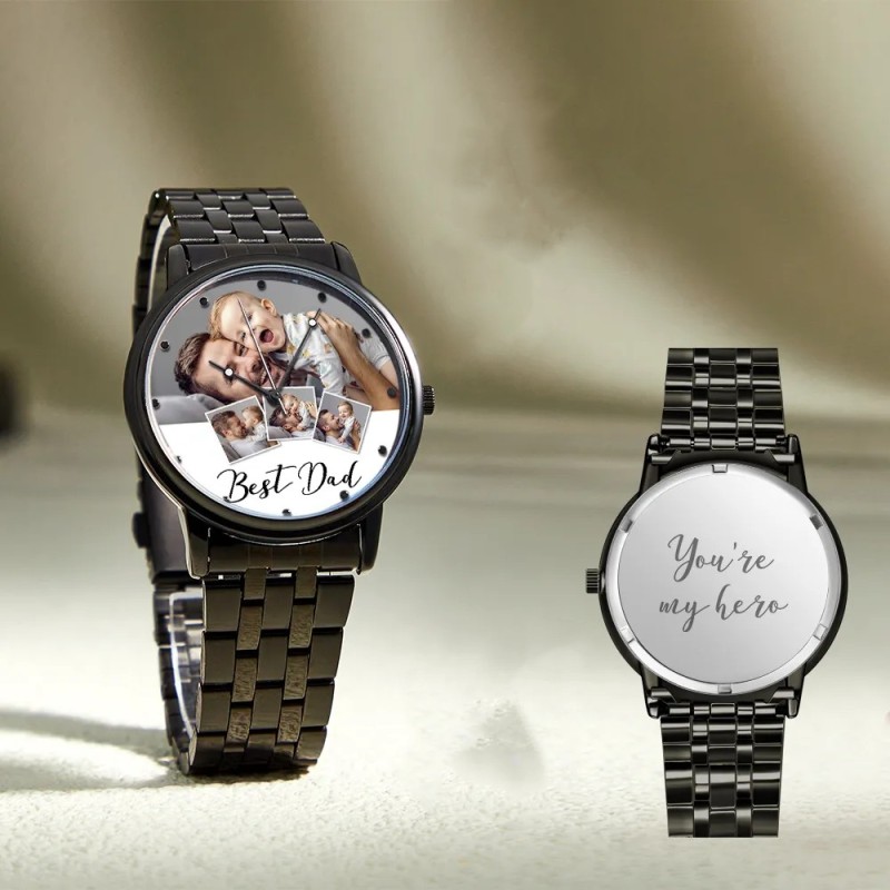 Personalized Engraved Photo Watch Men's Black Alloy Bracelet Photo Watch Father's Day Gifts For Dad
