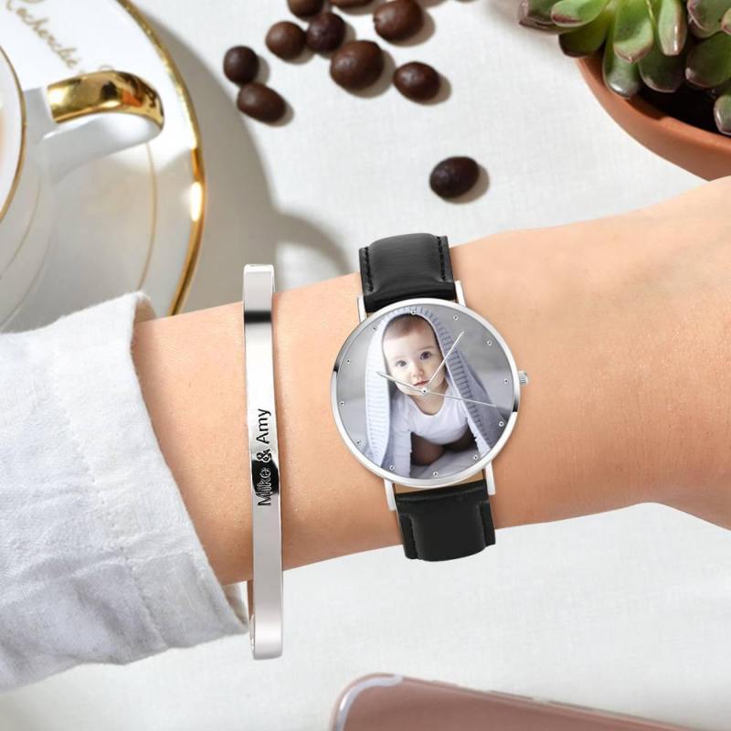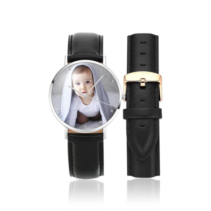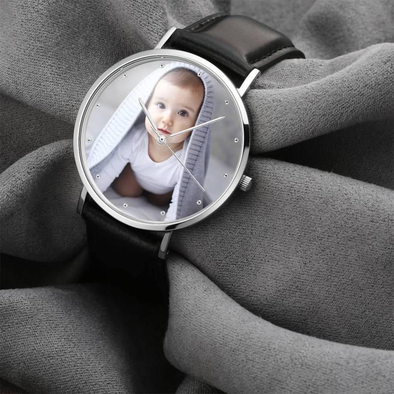 Personalized Engraved Watch, Photo Watch With Black Leather Strap