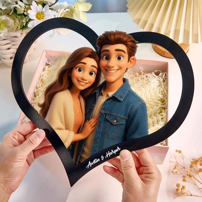 Personalized Heart-Shaped Cartoon Couple Frame|Your Photo Transformed into Custom Illustration|Add Names & Special Dates|Romantic Gift for Couples